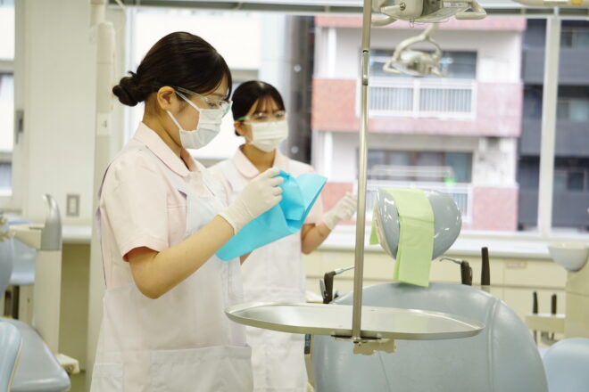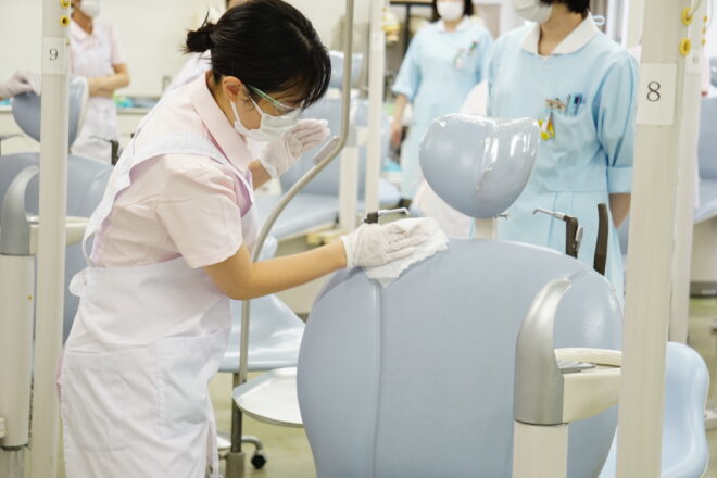 2024.10.15 実習 47期生が実習室の使い方を学びました 47期生(1年生)が相互実習を行うために、実習室の使い方を学びました。 安心・安全な実習を行うために、実習室での医療安全と感染予防についての知識を身に付けましたよ📓 この実習では術者・補助者・患者のそれぞれの役割を理解し、チェアーの消毒手順や滅菌器具の取り扱い、使用した器具の後片付けまで実習室での基本動作を学びました。