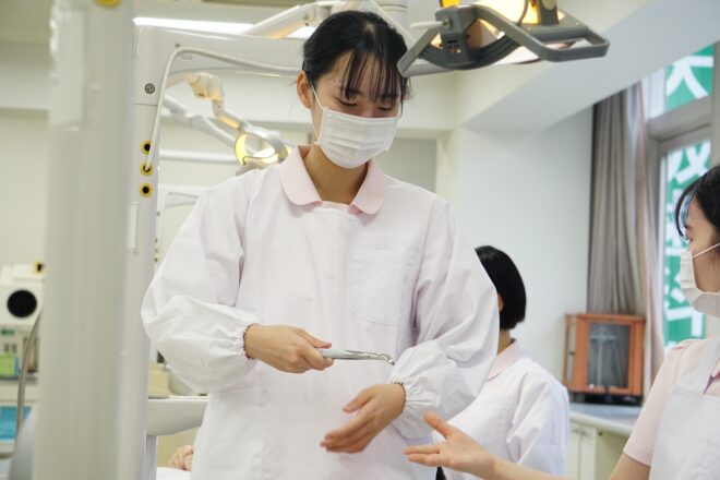 2024.11.20 実習 47期生が器具の受け渡しの実習を行いました 47期生(1年生)が器具の受け渡しの実習を行いました。 今回の実習では実際の医療現場で使われるメスや針を使用します。 安全に配慮しつつ、特に患者さんの頭の上で受け渡しをしないよう注意しましょう👀 メスでの切開や針での縫合は歯科衛生士は行いませんが、使い方を知っておかないと施術する人がスムーズに治療できないため器具の渡し方や名称だけでなく使い方も覚えましょうね💭