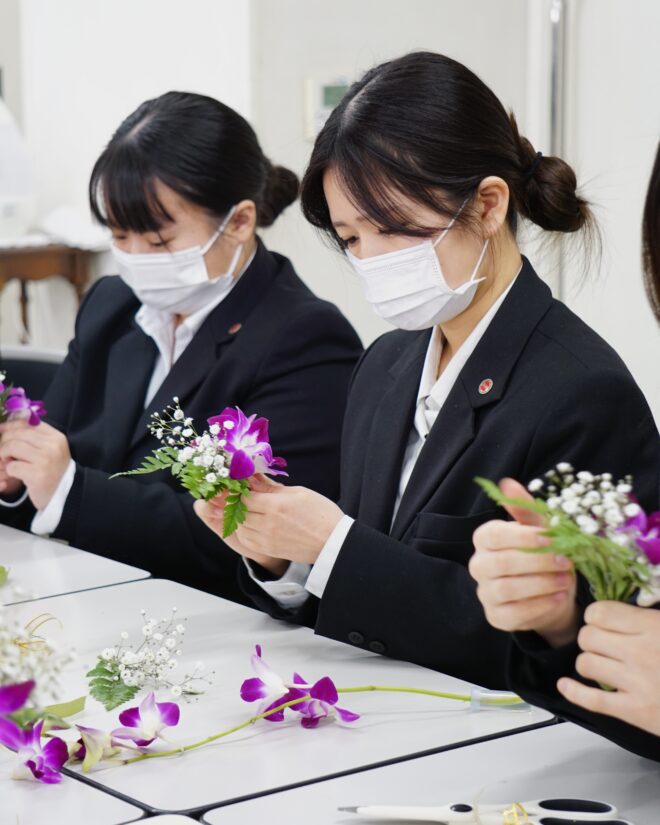 2025.03.10 授業 3年生が卒業式で胸に付けるコサージュを47期生が作りました 3年生が卒業式で胸に付けるコサージュを47期生(1年生)が作りました💐 小原流の先生方に来ていただき、作り方を教えてもらいましたよ。 毎年本校では1年生が卒業式を迎える3年生にコサージュを作製しています。デンファレやかすみ草などの生花を使っています。 3年生は明日の卒業式、楽しみにしててくださいね✨✊🏻