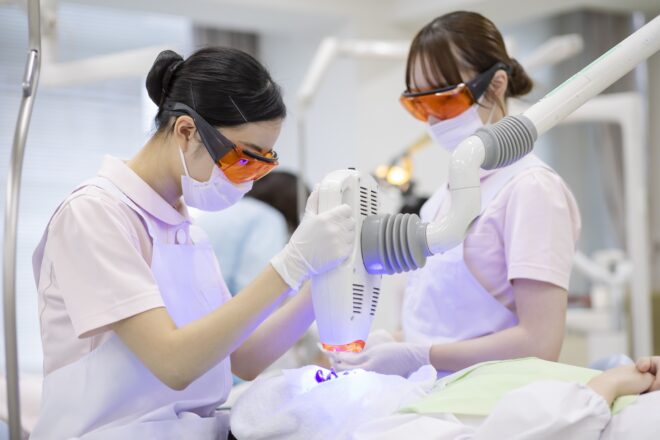 2025.12.12 実習 46期生がオフィスホワイトニングの相互実習を行いました 46期生(3年生)がオフィスホワイトニングの相互実習を行いました。 実際に光照射まで行い、患者役の学生はホワイトニング体験もしてもらいました。 最近多くの歯科医院では歯科衛生士が実際にオフィスホワイトニングの施術を行うため、本校ではホワイトニングの実習や講義に力を入れていますよ🦷✨ ホワイトニングについての具体的な説明や処置中の注意点も学べたかと思います😌 ちなみにホワイトニングの実習をここまで本格的にできるのは珍しいですよ👀