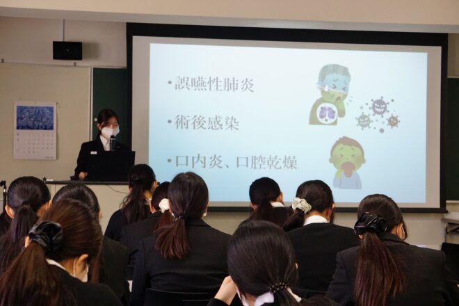 2025.12.18 授業 46期生が2年生に症例報告会を行いました 46期生(3年生)が2年生に症例報告会を行いました。 現在臨床実習に出ている2年生に、3年生が臨床実習で体験し気付いたこと・調べたことを発表しました💻 発表後は2年生と3年生で質疑応答の時間もありましたよ☺️ 発表に関しての質問や、臨床実習の話が飛び交っていました。